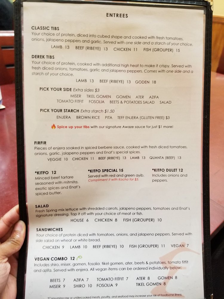 - Entrées: Savor the Classic Tibs or the crispy Derek Tibs, both showcasing your choice of protein within a medley of fresh vegetables and spices.